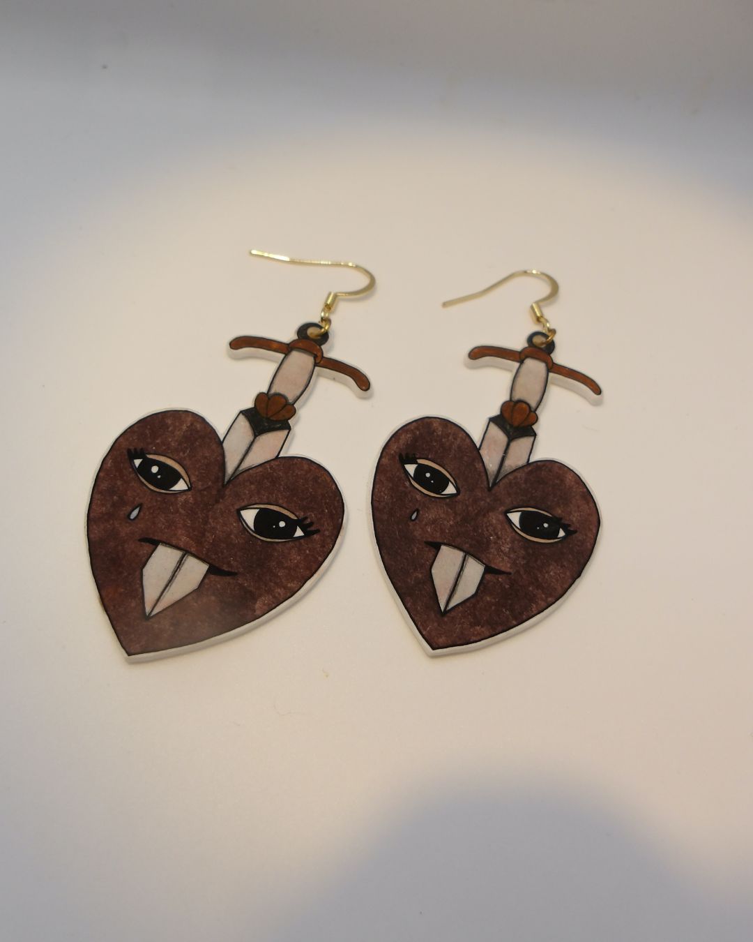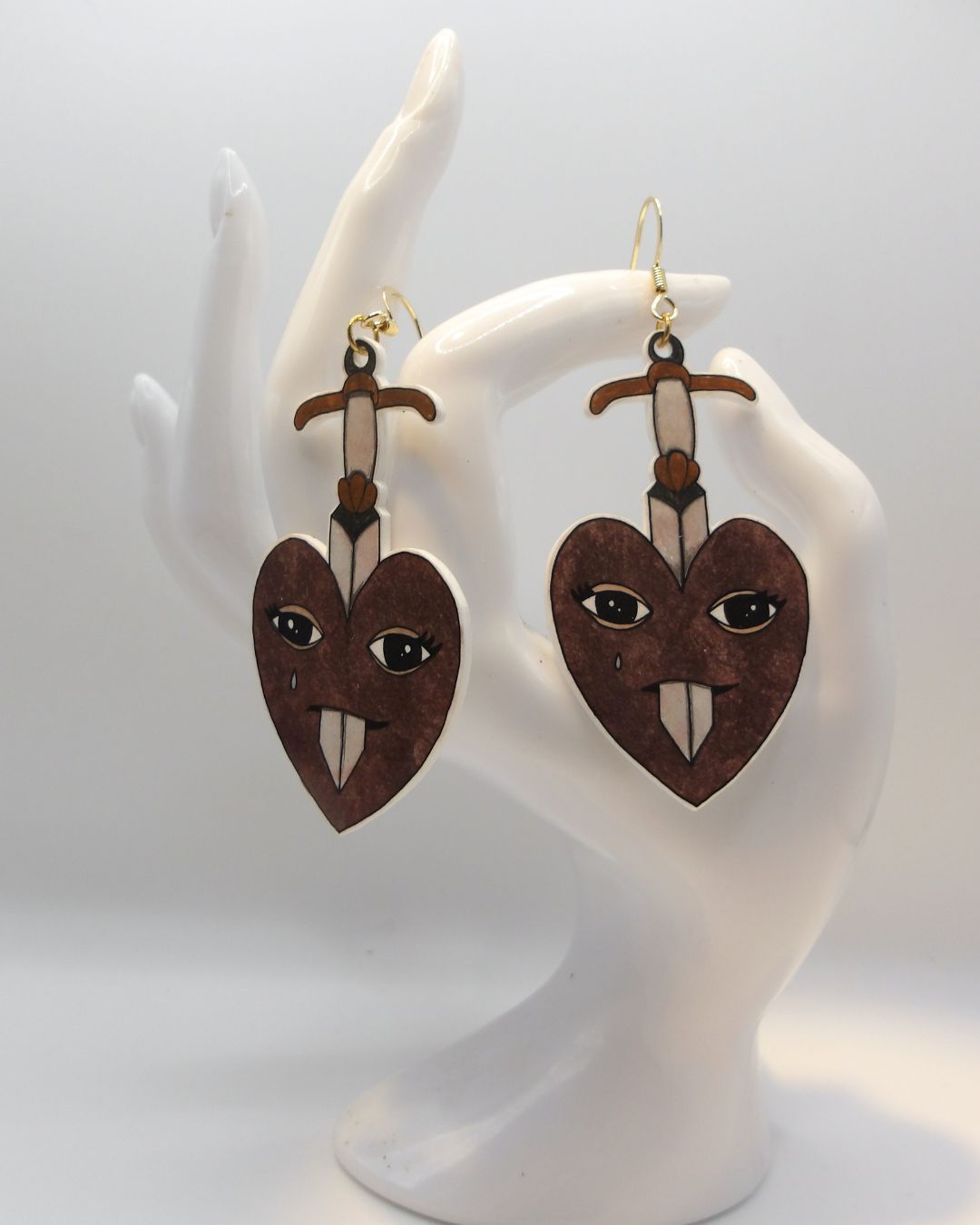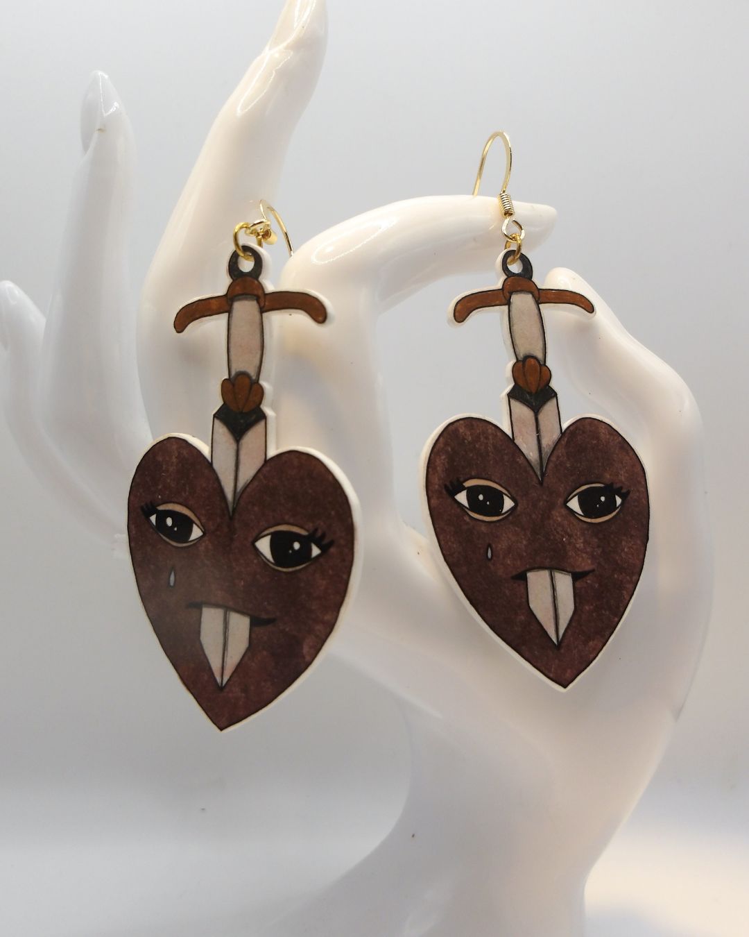 Handgemaakte oorbellen zilverkleurig - hart met zwaard