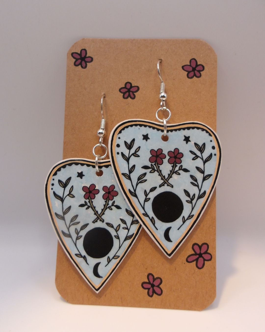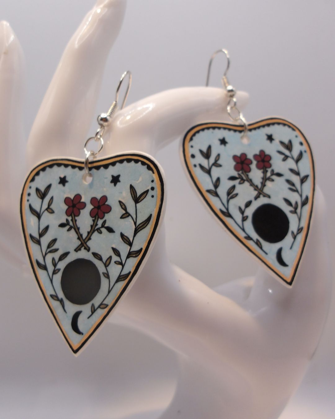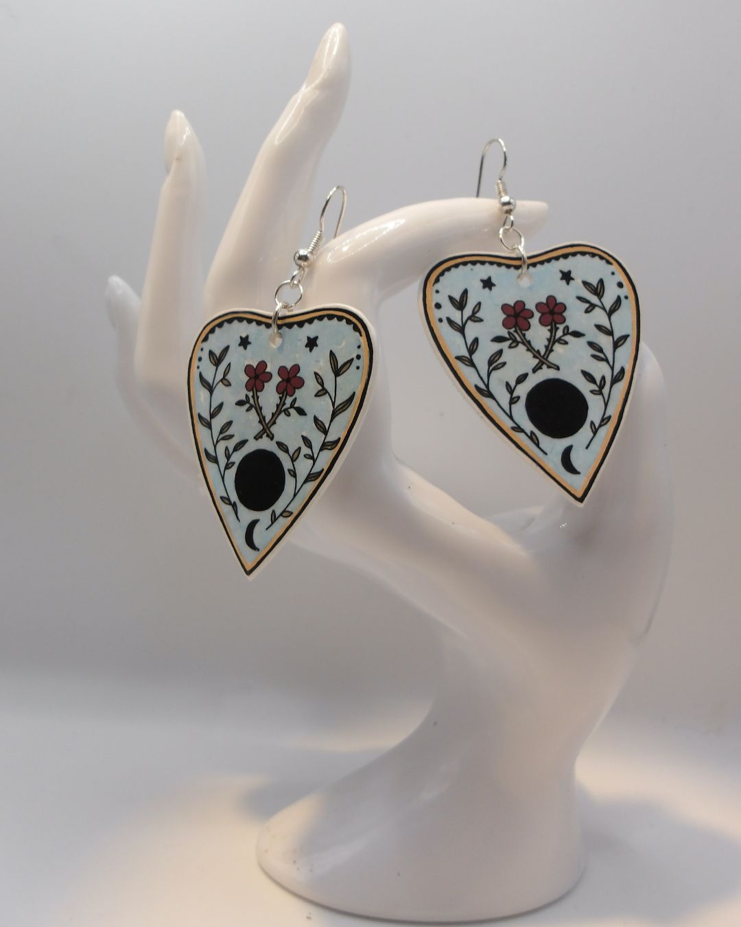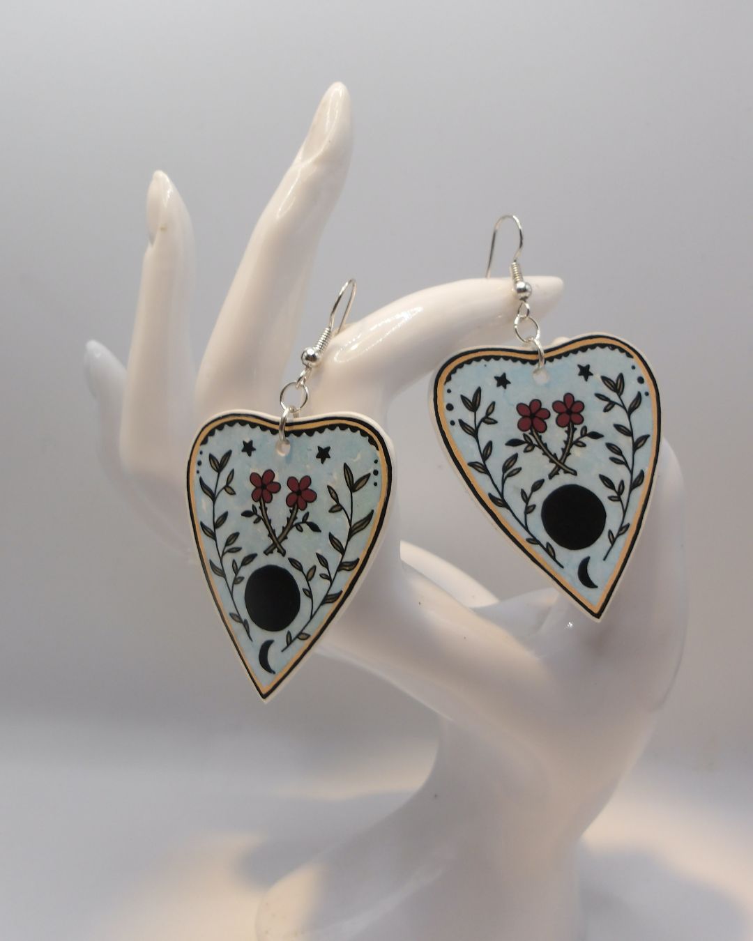 Handgemaakte oorbellen zilverkleurig - Ouija met bloemen