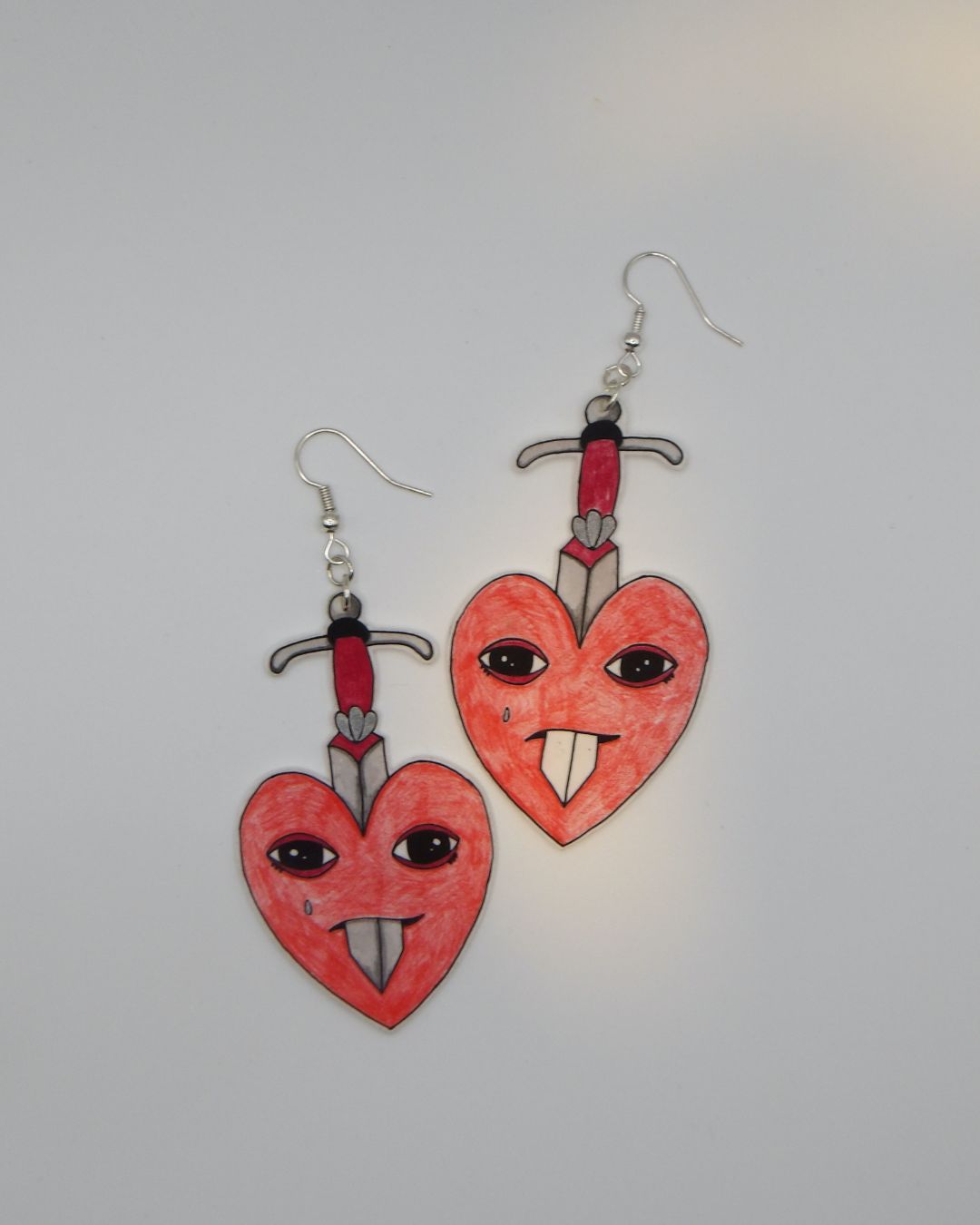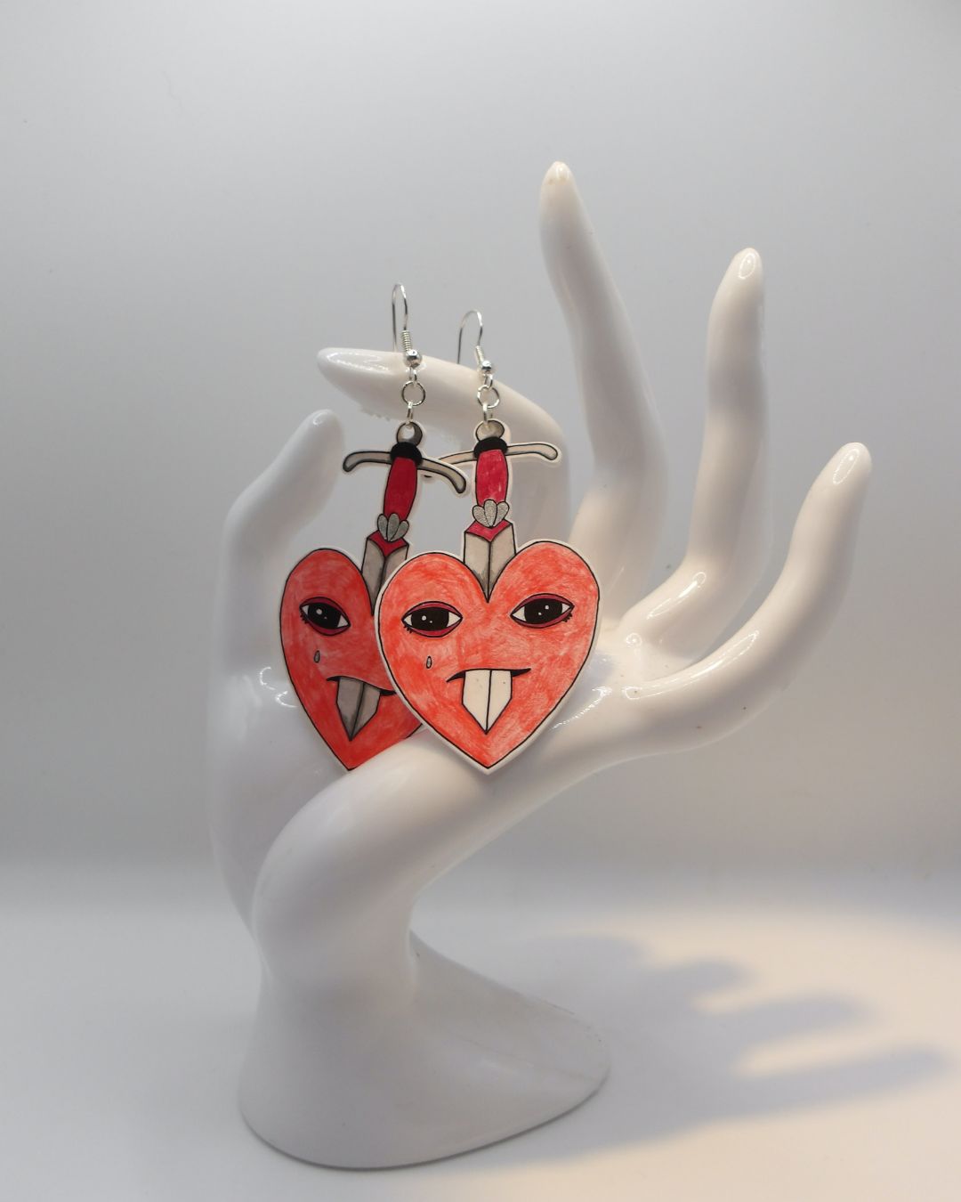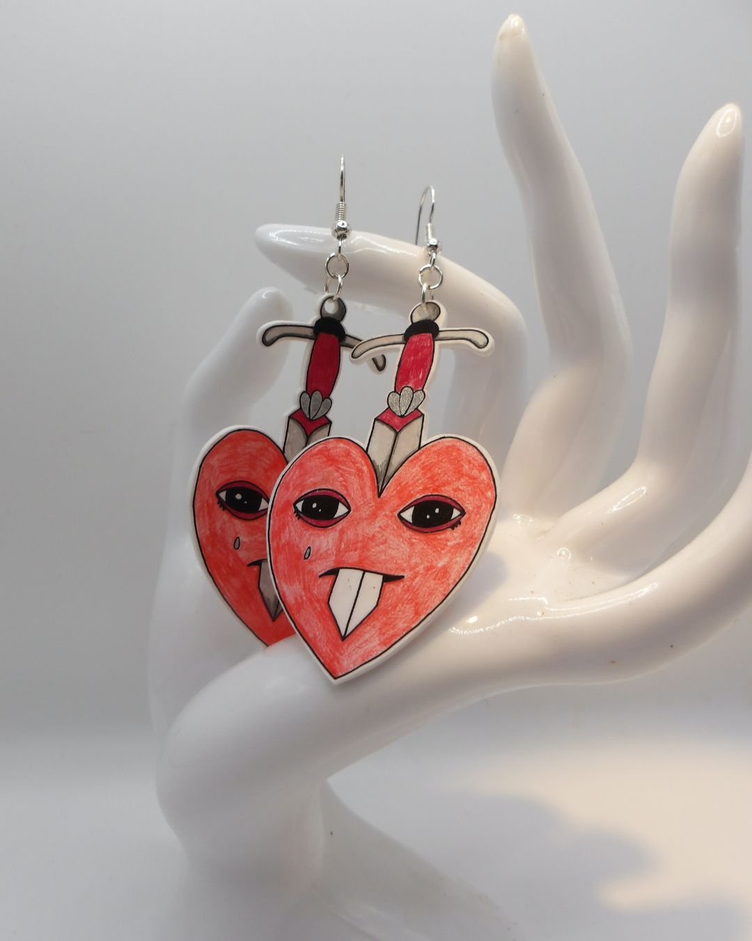 Handgemaakte oorbellen zilverkleurig - rood hart met zwaard