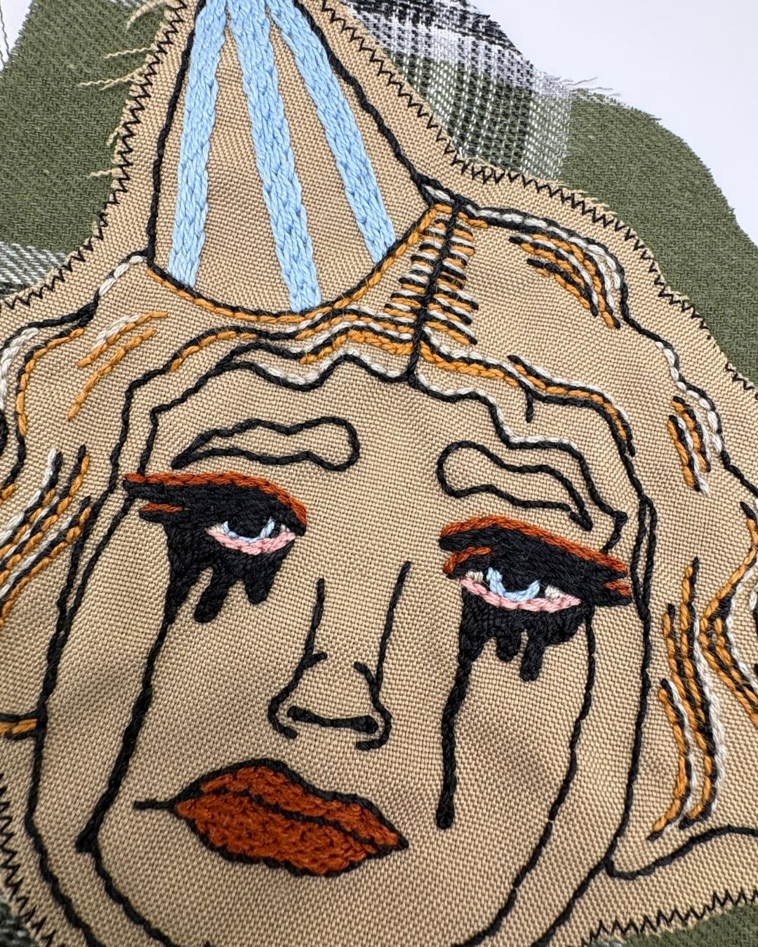 Dit is een handgemaakte appliqué, met de hand geborduurd en bevestigd op een groene stof, deze groene boord kan ik kleiner maken, die op een kledingstuk naar keuze wordt bevestigd.