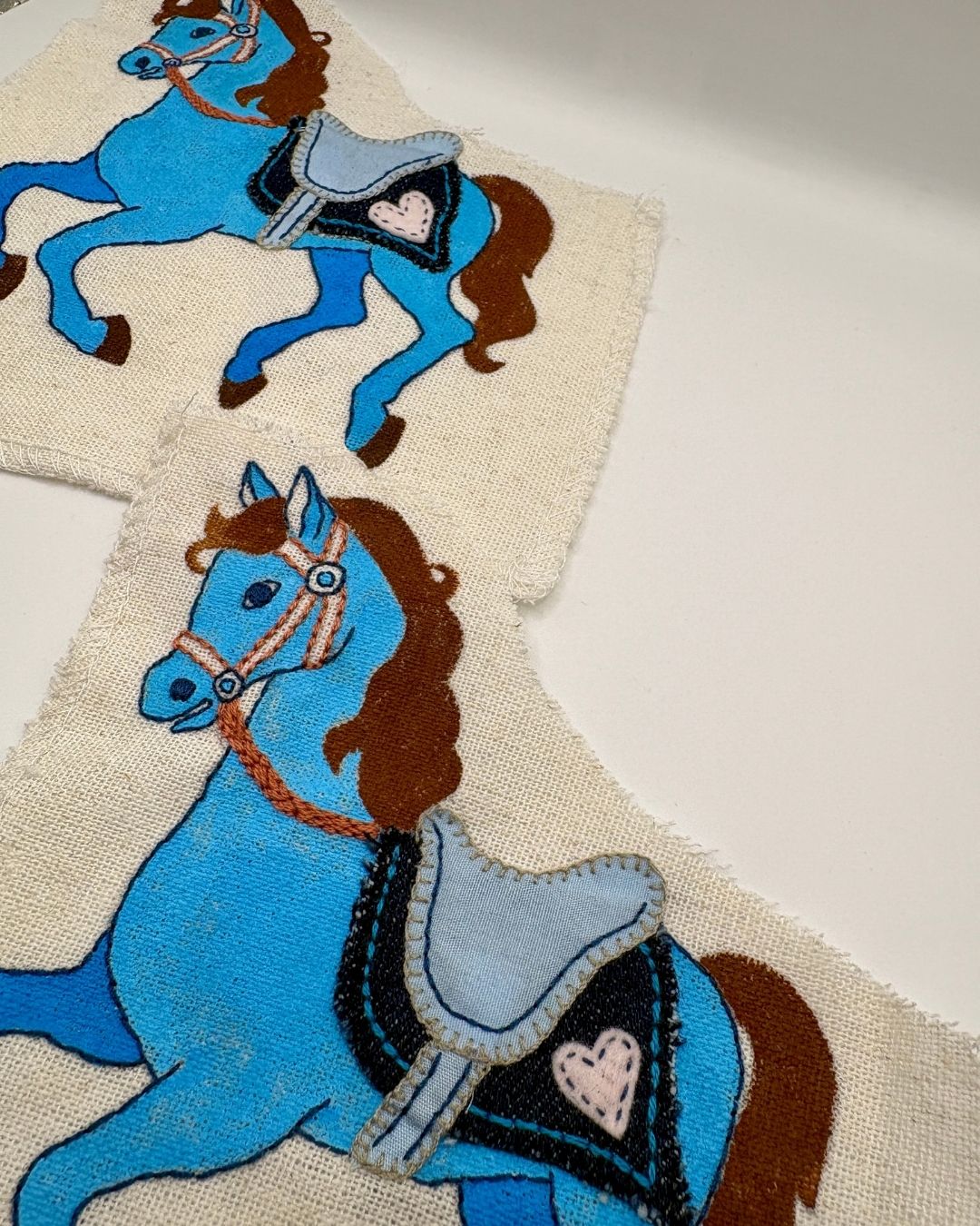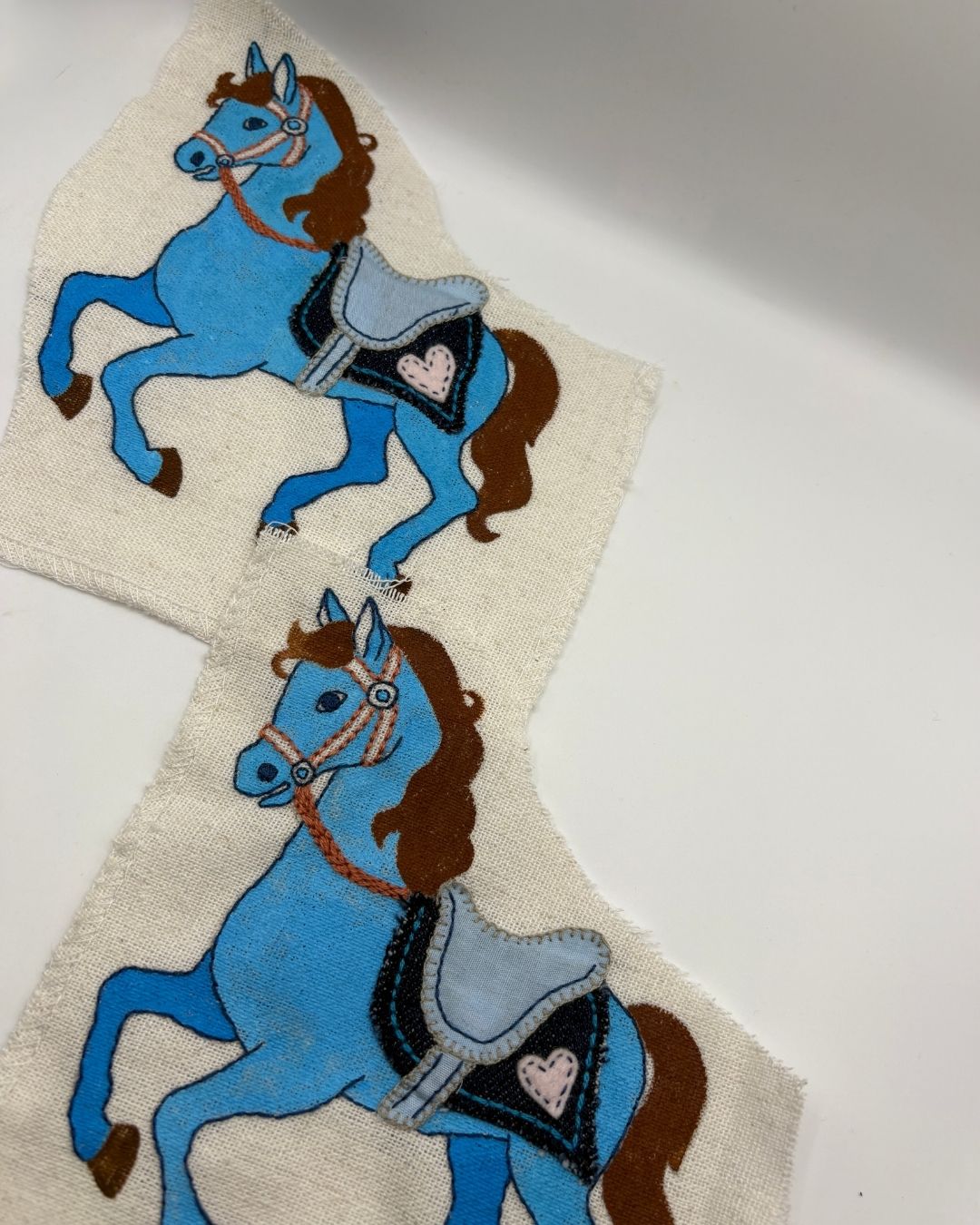 Dit zijn 2 handgemaakte appliqués, met de hand geverfd met enkele geborduurde details, die op een kledingstuk naar keuze wordt bevestigd.